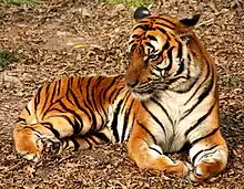 | Malayan tiger formerly P. t. jacksoni (Luo et al., 2004)[31] | The Malayan tiger was proposed as a distinct subspecies on the basis of mtDNA and micro-satellite sequences that differ from the Indochinese tiger.[31] It does not differ significantly in fur colour or skull size from Indochinese tigers.[30] There is no clear geographical barrier between tiger populations in northern Malaysia and southern Thailand.[1] | ![]() |
