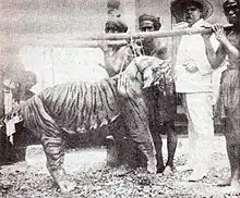 The tiger attacks from behind or at the sides and tries to knock the target off balance. It latches onto prey with its forelimbs, twisting and turning during the struggle and tries to pull it to the ground. The tiger generally applies a bite to the throat until its victim dies of strangulation.[47][124][125][126] It has an average bite force at the canine tips of 1234.3 newtons.[127] Holding onto the throat puts the cat out of reach of horns, antlers, tusks and hooves.[124][128] Tigers are adaptable killers and may use other methods, including ripping the throat or breaking the neck. Large prey may be disabled by a bite to the back of the hock, severing the tendon. Swipes from the large paws are capable of stunning or breaking the skull of a water buffalo.[129] They kill small prey with a bite to the back of the neck or head.[130][54] Estimates of the success rate for hunting tigers range from a low of 5% to a high of 50%. They are sometimes killed or injured by large or dangerous prey like gaur, buffalo and boar.[54]