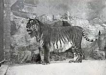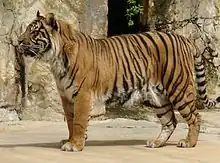 Nine recent tiger subspecies have been proposed between the early 19th and early 21st centuries, namely the Bengal, Malayan, Indochinese, South China, Siberian, Caspian, Javan, Bali and Sumatran tigers.[9][10] The validity of several tiger subspecies was questioned in 1999 as most putative subspecies were distinguished on the basis of fur length and colouration, striping patterns and body size of specimens in natural history museum collections that are not necessarily representative for the entire population. It was proposed to recognise only two tiger subspecies as valid, namely P. t. tigris in mainland Asia and the smaller P. t. sondaica in the Greater Sunda Islands.[11]