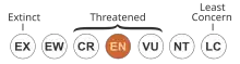 The tiger has been listed as Endangered on the IUCN Red List since 1986 and the global tiger population is thought to have continuously declined from an estimated population of 5,000–8,262 tigers in the late 1990s to 3,726–5,578 individuals estimated as of 2022.[1] During 2001–2020, landscapes where tigers live declined from 1,025,488 km2 (395,943 sq mi) to 911,901 km2 (352,087 sq mi).[65] Habitat destruction, habitat fragmentation and poaching for fur and body parts are the major threats that contributed to the decrease of tiger populations in all range countries.[1]