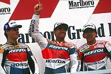 Crivillé on the podium at the Japanese Grand Prix, alongside Repsol Honda compatriots Mick Doohan (center) and Tadayuki Okada (right).
