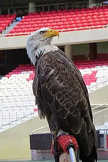 Vitória is a bald eagle (Haliaeetus leucocephalus), trained by André Rodrigues since April 2011.[5] The original eagle Vitória, whose trainer was Juan Bernabé, flew in the inauguration of the Estádio da Luz on 25 October 2003. It was apprehended days later and released in May 2006. In the meantime, it was replaced by a similar eagle with the same name.[6]