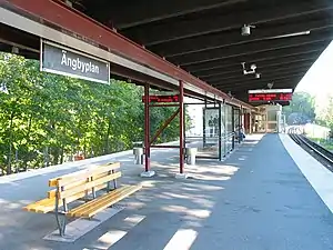 Ängbyplan metro station, formerly known as Färjestadsvägen metro station, is a station on the Green line of the Stockholm metro. It is located in the district of Södra Ängby, which is part of the borough of Bromma in the west of the city of Stockholm. The station is above ground and has a single island platform, with access from the underpass taking Färjestadsvägen under the line.[3][4] The distance to Slussen is 12.4 kilometres (7.7 mi).[1]