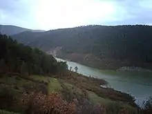 Çınarcık Dam is a rock-fill dam on the Orhaneli River about 30 km (19 mi) east of Mustafakemalpaşa in Bursa Province, Turkey. It serves several purposes to include power, irrigation, flood control and municipal water supply to the city of Bursa. The dam was constructed between 1996 and 2002.[1] Construction of the Uluabat Hydroelectric Station, which the dam supplies water to, began in 2006 and it was commissioned in 2010. The 125 m (410 ft) tall dam diverts water north through an 11.27 km (7.00 mi) long tunnel where it reaches the power station on the southern bank of Lake Uluabat. Water discharged from the 100 MW power station then enters the lake. The dam and power station are owned by the Turkish State Hydraulic Works.[2][3][4][5]