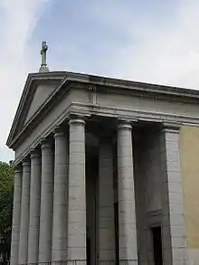 This church has a neoclassical style and looks like a Greek temple.[5] It has a Latin cross form, and its facade has a Doric portico, topped by a triangular pediment,[1] and many Doric columns.[6] Above the six columns of the facade, there are a frieze and a triangular pediment with a cross.[3]