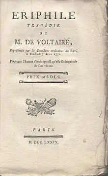 Ériphyle is a tragedy in five acts by Voltaire. He began working on it in 1731 and it was completed and performed in 1732. The poor success of the stage premiere prompted Voltaire to cancel the printed version.