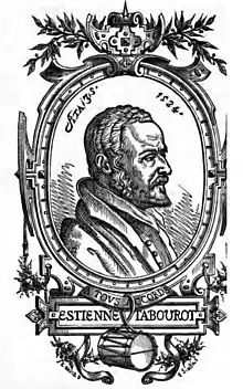 He was born in Dijon.[1] His uncle, Jean Tabourot (1520-1595), was a writer, canon and religious official in Langres.[2] Étienne Tabourot did his studies at the College de Bourgogne in Paris and then at the university of Toulouse where he studied law.[1] Returning to Dijon, in 1582 he bought an office of "King's attorney" ("procureur du roi") in the jurisdiction of Dijon and became an active member of the Catholic League during the French Wars of Religion.[1]