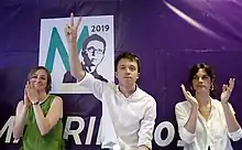 In January 2019, Errejón announced he would run in the regional election under the Más Madrid list,[48] the platform previously presented by Manuela Carmena (the Mayor of Madrid) in order to run in the municipal election (both the regional and municipal elections were to be celebrated on 26 May). While the initiative of Más Madrid was purposely open to further negotiation to include Podemos in some form (it was framed by Errejón as an "invitation" rather than as a "split"),[49] this formal unlinking from the party unleashed an internal crisis in Podemos. The crisis' toll took Ramón Espinar (the regional leader of Podemos in Madrid), who quit frontline politics in disagreement with the decision taken by Iglesias of actually presenting an alternative list to Errejón's in the regional election[50] (Podemos had convened not to present an alternative list to Carmena's vis-à-vis the municipal election). Errejón was then asked to leave his seat of deputy, and he (still leaving a door open to reach a unitary list of Más Madrid with Podemos, IU and Equo) quit the Congress of Deputies on 21 January.[51]