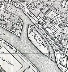 Originally the island was used for pasturage, but in 1549 the city of Paris erected a fort, a bridge and a marina, where a naval battle and the seizure of a fortress were enacted for the entertainment of Henri II and Catherine de Medici.[2][3] In 1613, under Louis XIII, for the feast of Saint-Louis, a small castle filled with fireworks was erected on the island and set on fire. The twelve-year-old king and his mother were able to admire the display from their grandstand on the quai des Célestins.[3]