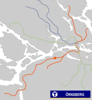 Örnsberg metro station is a station on the red line of the Stockholm metro, located in Aspudden in the south part of Stockholm Municipality. The station was opened on 5 April 1964 as the southwest terminus of the first stretch of the Red line, from T-Centralen to Örnsberg, with a branch to Fruängen. On 16 May 1965, the line was extended further southwest to Sätra.[2]