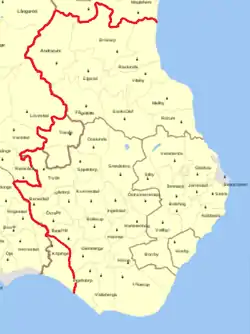 Österlen was defined in 1929 as including Albo härad, Ingelstad härad and Järrestad härad in the southeastern part of the Scania. Today the term is associated with Tomelilla Municipality, Ystad Municipality and Simrishamn Municipality. Österlen encompasses the cities of Simrishamn and Tomelilla as well as including Stenshuvud National Park.[10] The map that is published here is not historically correct in that Ingelstad härad/hundred included all the territory to the city of Ystad itself. There were temporary redrawings of this and other borders but from the beginning of the hundred system, Ingelstad went to the city of Ystad, and locations like Nybro and Köpinge are included in our first descriptions of Österlen.