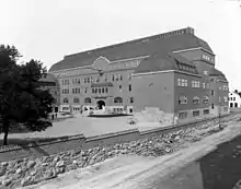 The current building of Östra Real was completed in 1910, but it was not officially inaugurated until January 1911 by King Gustav V. The building was designed by Ragnar Östberg in the National Romantic style. The inside of the building has undergone many renovations, with many of the original characteristic features being changed. The most thorough renovation was started in 1976. In the music hall there are murals by Georg Pauli and the decoration in the staff room is by the artist Filip Månsson. The school also has sculptures by Carl Eldh and Carl Milles and frescos by Axel Törneman and Prince Eugen.