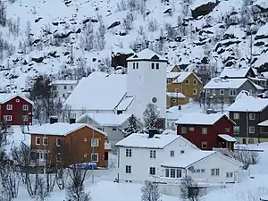 Øksfjord Church (Norwegian: Øksfjord kirke) is a parish church of the Church of Norway in Loppa Municipality in Finnmark county, Norway. It is located in the village of Øksfjord. It is main church for the Loppa parish which is part of the Alta prosti (deanery) in the Diocese of Nord-Hålogaland. The stone church was built in a long church style in 1954 using plans drawn up by the architect Hans Magnus. The church seats about 210 people.[1][2]