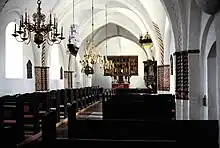 In 1995, the nave was restored and frescos from the beginning of the 16th century were uncovered. The frescos include a depiction of Saint Antonius and the arms of Christen Skram and his wife Anne Reventlow. Frescos on one of the vaults are dated as 1656, which is presumably the date of a previous restoration. A votive ship also hangs in the center of the nave which was installed in 1920.