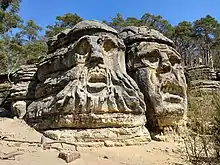 The sculptures have been damaged by time and weather.[3] In 2011, the private owner had the surrounding pine forest cut down, allowing the heads to be seen from the I/9 road.[4] Further sandstone reliefs can be found near the Čertovy hlavy, known as Harfenice ('Harpist') and Had ('Snake') reliefs.