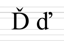 The grapheme Ď (minuscule: ď) is a letter in the Czech and Slovak alphabets used to denote /ɟ/, the voiced palatal plosive (precisely alveolo-palatal), a sound similar to British English d in dew.[1][2] It was also used in Polabian. The majuscule of the letter (Ď) is formed from Latin D with the addition of a háček; the minuscule of the letter (ď) has a háček modified to an apostrophe-like stroke instead of a wedge. When collating, Ď is placed right after regular D in the alphabet.