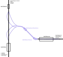 The plan for conventional rail tunnel consisted of a double-track tunnel running between Łódź Fabryczna station and railway line no. 15, running between Łódź Kaliska and Łódź Żabieniec stations, with the possibility for both stations to access the tunnel. The plan proposed the construction of two additional stops: Łódź Śródmieście and Łódź Polesie. Łódź Śródmieście will be located under the intersections of Zielona and Zachodnia streets with Kościuszko Avenue. Łódź Polesie is proposed to be located near the intersections of Ogrodowa and Jan Karski streets, near the Manufaktura shopping gallery (former site of I. Poznański's textile factory). The double-track connection with Kaliska and Żabieniec stations will be provided by an underground branch post Łódź Włókniarzy, where the tunnel will split firstly into 2, then into 4 single-track tunnels - a pair for each station.[8] The total length of the tunnel is estimated to be approximately 2.7 kilometres (1.7 mi).[9]