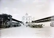 Łódź Kaliska is one of the two main railway stations in the central Polish city of Łódź. It is located west of the center of the city, in the district of Polesie, and it consists of six platforms. The first complex of the station, designed by Polish architect Czesław Domaniewski, was built in 1902 in the style of Art Nouveau. Inside, there were several Art Nouveau elements, including crystal windows in doors, as well as brass fittings. The station served the Warsaw–Kalisz Railway, built between 1900 and 1902.