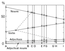 The horizontal axis (in Ōno's formulation) is arbitrary, and should not be interpreted as time. The graph in the re-formulation by Mizutani is more easily interpreted, and shows a scatter plot of nouns versus other word classes.