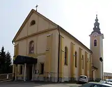 Saint James' Church was built in 1899 at the site of a former church that was destroyed in the 1895 Ljubljana earthquake. The Baroque bell tower of the old church was incorporated into the new structure.[1][2] The church is decorated with a 1913 fresco by Simon Ogrin (1851–1930). The church initially belonged to the proto-parish of Mengeš,[2] but was made the seat of a parish in 1787.[1][2]