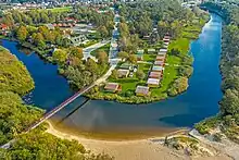 Šventoji (Samogitian: Švėntuojė; Latvian: Sventāja) is a small resort town on the coast of the Baltic Sea in Lithuania. Administratively it is part of Palanga City Municipality. The total population of Šventoji as of 2012 was 2631. The town is located about 12 km north of Palanga center and close to the border with Latvia. Further north of the town is Būtingė and its oil terminal. Šventoji River flows into the Baltic sea at the town. The town also has a famous lighthouse, which is located 780 meters from the sea. Its height is 39 meters. The town is a popular summer resort for families, during summer it has many cafes, restaurants and various attractions for the visitors.