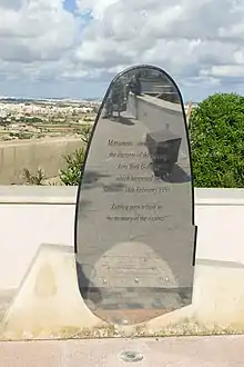 There is memorial at the National Memorial Arboretum, a British site of national remembrance at Alrewas, near Lichfield, Staffordshire.[4] Another memorial is located at Il-Ġibjun Gardens in Żurrieq, Malta, close to the crash site.[5]