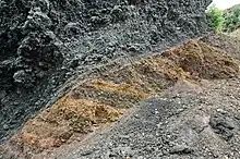 Then came another kind of volcanic (magmatic) activity, with less developed layering, which deposited black to dark-brown (melanephelinitic), slightly welded material, which contains fragments and blocks of porous lava, larger chunks of solidified lava known as volcanic bombs, and smaller fragments known as lapilli.[5]