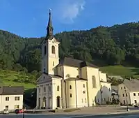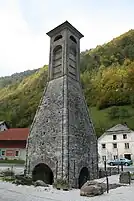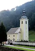 The parish church in Železniki is dedicated to Saint Anthony and stands in Trnje on the left bank of the Selca Sora River. It was built between 1872 and 1874 in the Renaissance Revival style at the site of an earlier church that burned down in 1822. The church was built by Franc Faleschini based on a design by Štefan Šubic. The bell tower was damaged by fire in 1944, but was repaired in 1997.[4] The church contains works by Janez Wolf, Janez Gosar Sr., and Ludovik Grilc.[5] Saint Francis Xavier Church stands on the opposite side of the river in Log. It was built in 1707 in the Baroque style, with a barrel-vaulted chancel and nave. The chancel vault and arch were painted by Štefan Šubic in 1857. The cemetery around the church was established in the early 19th century.[6]