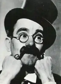 During this period Gray perfected his trademark "Cockney-French". The humorist Paul Jennings, who called him "the funniest man in the world", gave an instance of it: "Je got 'ere un packet de cards, cinquante deux in numero. I cuttee in deux, with vang-seess ici and vang-seess there-si".[6] His stage costume included a pair of metal-rimmed glasses and a looped moustache below a large nose that grew increasingly red over the years.[3]