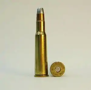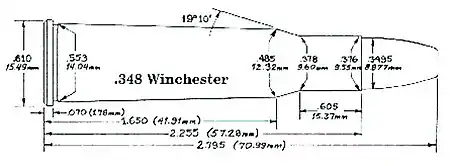 The .348 Winchester is an American rifle cartridge. It was introduced in 1936, and developed for the Winchester Model 71 lever action rifle. The .348 was one of the most powerful rimmed rounds ever used in a lever action rifle.[3]