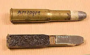 The 10.15×61 mmR cartridge was designed by a joint Swedish-Norwegian rifle commission in the late 1870s and early 1880s, and approved for use in Sweden and Norway in 1881. It was primarily used by Norway in the Model 1884 Jarmann rifle, but also saw limited use in Sweden in the m/1867-84 rolling block rifle and carbine ("kammarskjutningsgevär m/1884" and "kammarskjutningskarbin m/1884", which were primarily used for gallery shooting, that is short range training).[1] It is a rimmed, centerfire cartridge, and was initially loaded with black powder and a lead bullet wrapped in paper. Later cartridges were loaded with smokeless powder and had a lead bullet coated in steel (Full metal jacket, or FMJ).