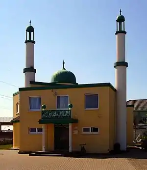 Fazl-e-Omar Mosque Eimsbüttel Hamburg 1957 Named after Second Caliph Mirza Basheer-ud-Din Mahmood Ahmad, built before 1989, foundation 22 February 1957, completed 22 June 1957, plot 1,500 m2 (16,000 sq ft), prayer hall 40 m2 (430 sq ft), two minarets at 8 m (26 ft) height 53°35′0.9″N 9°56′36.2″E / 53.583583°N 9.943389°E / 53.583583; 9.943389 (Fazl-e-Omar Mosque)[M 1]