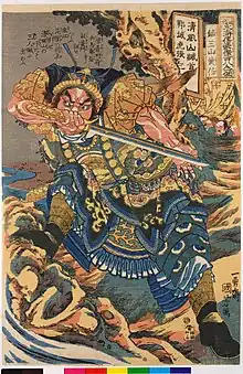 | 14 | 14 | Tianshang (天傷); Harm Star (天傷星) | Wu Song (武松; Wǔ Sōng; Wu Sung) | "Pilgrim" (行者); "Tiger-fighting Hero" (打虎英雄) | Chief Wu (武都頭); Grandmaster Qingzhong (清忠祖師) "Wu the Second" (武二郎) | Infantry | Infantry leader | Constable | Qinghe County, Xingtai, Hebei | 23 | Pair of sabres, staff | ![]() | Survives | |