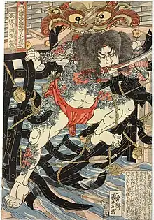 | 23 | 23 | Tianwei (天微); Minute Star (天微星) | Shi Jin (史进; 史進; Shǐ Jìn; Shih Chin) | "Nine Tattooed Dragons" (九紋龍) | Eight Tiger Cub Vanguard Generals (cavalry) | Squire | Huayin County (present-day Huayin, Weinan, Shaanxi) | 2 | Staff, Pudao | ![]() | Dies at the battle of the Yuling Pass | |||