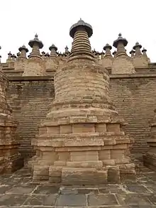 The 108 stupas are believed to have been originally constructed during the period of the Western Xia kingdom (1038–1227), as part of a Buddhist temple complex.[2] The remains of a temple and two small stupas were originally located in front of the 108 stupas, but due to the construction of a dam nearby (which for some years caused the area in front of the stupas to be flooded), in 1958 the two stupas were demolished. Two Western Xia period silk Buddhist paintings were found inside the two stupas, and fragments of Tangut Buddhist texts, miniature terracota stupa models, and clay tsha-tsha (small tablets made of stamped clay) were also found in the vicinity of the temple.[2][4] Further evidence that the temple complex dates back to the Western Xia comes from an octagonal brick platform (on which a stupa would originally have stood) which is located on the hillside just north of the 108 stupas. In 1987 fragments of Buddhist sutras written in the Tangut script were discovered in this platform, together with about a dozen clay stupa models. Artefacts discovered during the renovation of the 108 stupas included four painted clay Buddhist statues and over a hundred plain and painted clay stupa models (between 5 and 12.5 cm in height) from the large stupa, seven tsha-tsha from two of the small stupas (nos. 17 and 85), a painted clay Buddhist statue from stupa no. 41, and three pottery stupa finials (between 13 and 17.5 cm in height) from stupa no. 101.[1][4]