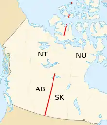In Canada, the meridian forms the boundary between Nunavut and the Northwest Territories north of the parallel 70° north. Originally 110°W was intended as the Fourth Meridian for the Dominion Land Survey, but because of the imperfect surveying methods of the time, the meridian was placed a few hundred metres west of this longitude. The Fourth Meridian has been the entire boundary between Alberta and Saskatchewan since 1905.