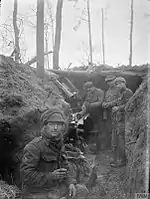 The regiment landed in France as part of the 1st Cavalry Brigade in the 1st Cavalry Division in August 1914 for service on the Western Front with the British Expeditionary Force.[24] The regiment took part in the Great Retreat and the regiment, working with the 2nd Dragoon Guards, conducted a cavalry charge which led to the capture of eight guns at Néry in September 1914.[9] In an action during the Battle of Messines in October 1914 a squadron from the regiment endured a heavy German bombardment that left many of its soldiers buried in a trench while another squadron from the regiment used a vantage point at the top of a building to train a machine gun on the Germans.[9] At the Second Battle of Ypres in April 1915 the regiment, working with the Durham Light Infantry and 9th Lancers, held the village of Hooge despite being under attack from the German forces using poison gas.[9] In spring 1918 the commanding officer of the regiment Colonel Rowland Anderson led a bayonet assault at Sailly-Laurette which, taking the Germans by surprise, led to them being completely repulsed.[9]
