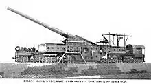 The gun car was positioned over the pit, the wheels were locked and the platform was locked into position with gun mount and car's weight shifted from the trucks (bogies) directly to the ground by jacks and lifting screws. The rails were removed from above the pit because the gun breech was too wide to pass between them.[9] The gun could elevate up to 43°, which gave it a maximum range of 42,000 yards (23.8 miles/38.4 km), and could be traversed 2.5° left and right of center. Any greater change of direction required the gun to be moved forward or backward along its curved track and a new recoil pit dug. The gun used the standard naval gun mounting and recoil system, with the addition of a pneumatic system to assist the runout springs to return the gun to firing position after recoil at the higher maximum elevation of 43° compared to maximum 30° in naval use.[10]