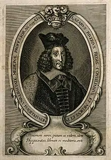 French physician and medical historian Lazare Rivière documented an anonymous physician's descriptions of a flu outbreak[22] occurring in the Languedoc region of France in July 1557.[26] The disease, often called coqueluche by the French,[27][28] caused a severe outbreak in Nîmes that featured a fast onset of symptoms like headaches, fevers, loss of appetite, fatigue, and intense coughing.[29][27][22] Most of those who died from the disease did so on the fourth day, but some succumbed up to 11 days after first symptoms.[27][22] Across Languedoc influenza had a high mortality rate, with up to 200 people per day dying in Toulouse at the height of the region's epidemic.[30] Italian physician Francisco Vallerioli, known as François Valleriola, was a witness to the epidemic in France and described the 1557 flu's symptoms as featuring a fever, severe headache, intense coughing, shortness of breath, chills, hoarseness, and expulsion of phlegm after 7 to 14 days.[24][26] French lawyer Étienne Pasquier wrote that the disease began with a severe pain in the head and a 12- to 15-hour fever[31] while sufferers' noses "ran like a fountain."[32] Paris saw its judiciary disrupted when the Paris Law Court suspended its meetings to slow the spread of flu.[33] Medical historian Charles-Jacques Saillant described this influenza as especially fatal to those who were treated with bleeding[14] and very dangerous to children.[29]