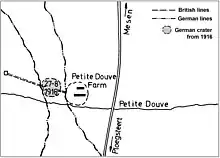 At the end of January 1916, 171st Tunnelling Company began mining operations at La Petite Douve Farm.[12] The farm, located next to the road from Messines to Ploegsteert Wood, was enclosed by a German trench system known as ULNA. Also at this point was a junction on the narrow gauge railway system which ran from the forward areas of Messines to the rear areas around Nieuwkerke. This operation was characterized by setbacks. Difficult geology lead to two mines being abandoned before completion, and after a charge of 23,000 kilograms (50,000 lb) of ammonal had been put in place beneath the farm, the gallery was discovered by a German counter-mining operation on 24 August 1916.[13] Three days later the German miners blew a heavy charge, which shattered about 120 metres (400 ft) of the main gallery and killed four men engaged in repairs. This camouflet wrecked the British gallery completely and forced the Royal Engineers to abandon the tunnel,[14] which then quickly flooded.[13]