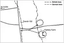 At the end of January 1917, the 171st Tunnelling Company began work on the deep mine at Ontario Farm. The ground at the site selected for this mine proved very difficult as much of it was sandy clay. The miners began to dig at Boyle's Farm which is just on the southern side of the main road (Mesenstraat/Nieuwkerkestraat) passing by. The shaft went down 30 metres (98 ft) and pumps were installed to bring air down and water out of the mine. After tunnelling forward, the miners broke into blue clay, extending the depth to some 40 metres (130 ft). After driving the gallery almost 200 metres (660 ft) forward, the flooding was so bad that a dam had to be constructed and a new gallery started. Despite these obstacles, the tunnellers arrived under Ontario Farm at the end of May 1917 and installed the 27,000 kilograms (60,000 lb) ammonal charge with a day to spare.[17] When it was detonated on 7 June 1915, the mine did not produce a crater but left a shallow indentation in the soft clay; the shock wave did great damage to the German position.[18][19] The explosion caught two battalions of the 17th Bavarian Infantry Regiment during a relief, half of which were "as good as annihilated".[20]