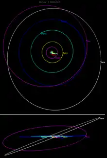 It orbits the Sun at a distance of 39.5–52.7 AU once every 313.1 years (over 114,000 days; semi-major axis of 46.1 AU). Its orbit has an eccentricity of 0.14 and an inclination of 21.5° with respect to the ecliptic.[1] As of November 2019, Varda is 47.5 AU from the Sun.[12] It will come to perihelion around November 2096.[6] It has been observed 321 times over 23 oppositions, with precovery images back to 1980.[1][2]