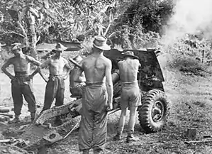 On 1 September 1944, 36th Indian Division was redesignated as a British division, the majority of the Indian Army units having been transferred.[11][14][18][24] The gunners of the rest of 178th Assault Fd Rgt were flown into Burma to join the division on 15 October (321 A/T Bty having returned unused to Shillong in September).[11][20] When NCAC began its post-Monsoon offensive on 16 October 1944, 36th Division was the only formation in contact with the enemy, and was the first to run into heavy opposition on 25 October, at a Japanese defensive position that blocked all roads. This was broken through on 29 October and Mawlu occupied on 31 October, but then the Japanese began to raid the division's precarious supply route and the advance halted until the following Chinese division broke through to Mawlu. Resuming its advance along the railway corridor, 36th Division captured Pinwe on 30 November, and occupied Indaw, Naba and Katha, reaching the Irrawaddy and Shweli Rivers without opposition during December. It continued to push along the river valleys in January 1945, meeting occasional rearguards, until it found the river crossing on the Shweli bend at Myitson to be strongly held.[25][26]