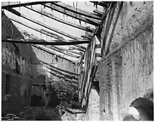 Damage was reported at Mission Santa Ines, Mission Santa Barbara, Santa Barbara Presidio, Mission San Buenaventura (Ventura), and Mission San Fernando as well.[15] One person was killed by a falling boulder at Agua Caliente. At the various missions, many houses, churches, chapels, and other structures totally collapsed.[14][16] Three adobe buildings were destroyed by the advancing tsunami. At Mission San Buenaventura and Mission Santa Barbara, the destruction was great, and a native man died when a building collapsed on him during an aftershock.[14]