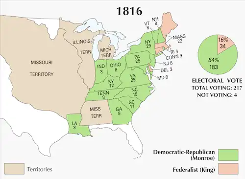 The 1816 United States presidential election was the eighth quadrennial presidential election. It was held from November 1 to December 4, 1816. In the first election following the end of the War of 1812, Democratic-Republican candidate James Monroe defeated Federalist Rufus King. The election was the last in which the Federalist Party fielded a presidential candidate.
