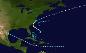 The ship Star of the South experienced heavy gales offshore the East Coast of the United States on June 30.[3] HURDAT lists the first tropical cyclone of the season beginning at 0000 UTC, while located about 100 miles (160 km) southeast of Cape Hatteras, North Carolina.[5] The storm moved slightly north of due east with winds of 60 mph (95 km/h).[5] It was last noted about 265 miles (425 km) north-northwest of Bermuda by the bark Virginia late on July 1.[3][5]
