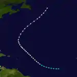 A tropical storm developed about 820 mi (1,320 km) west-southwest of the Cabo Verde Islands early on September 1.[5] On September 3, the Spanish brig Engracia became the first ship to encounter the storm.[4] That day, the cyclone intensified into a Category 1 hurricane while moving northwestward. The hurricane peaked with maximum sustained winds of 80 mph (130 km/h).[5] Early on September 6, the steamship Caribbean observed a barometric pressure of 982 mbar (29.0 inHg),[4] the lowest in relation to the storm. On September 7, the cyclone began moving northward and then northeastward later that day. The storm was last noted by the Knoch Train late on September 10,[4] about 450 mi (720 km) east of Newfoundland.[5]