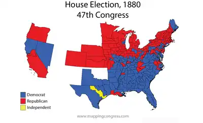 1880 House of Representatives election results on election day. (The results in the black-majority SC-5 and MS-6 were contested and later awarded to Robert Smalls and John R. Lynch by the Republican-majority House.[4])