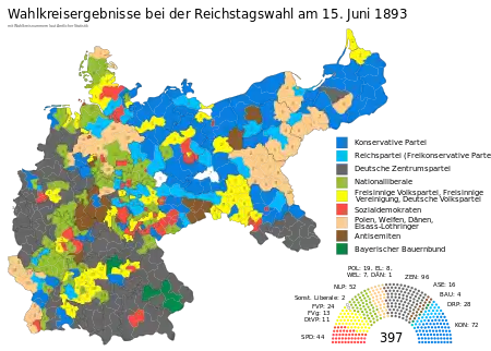 Federal elections were held in Germany on 15 June 1893.[1] Despite the Social Democratic Party (SPD) receiving a plurality of votes, the Centre Party remained the largest party in the Reichstag after winning 96 of the 397 seats, whilst the SPD won just 44.[2] Voter turnout was 72.4%.[3]