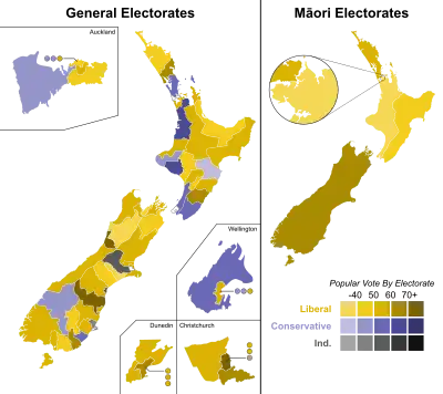 The following table gives party strengths and vote distribution according to Wilson (1985), who records Maori representatives as Independents prior to the 1905 election.[13]